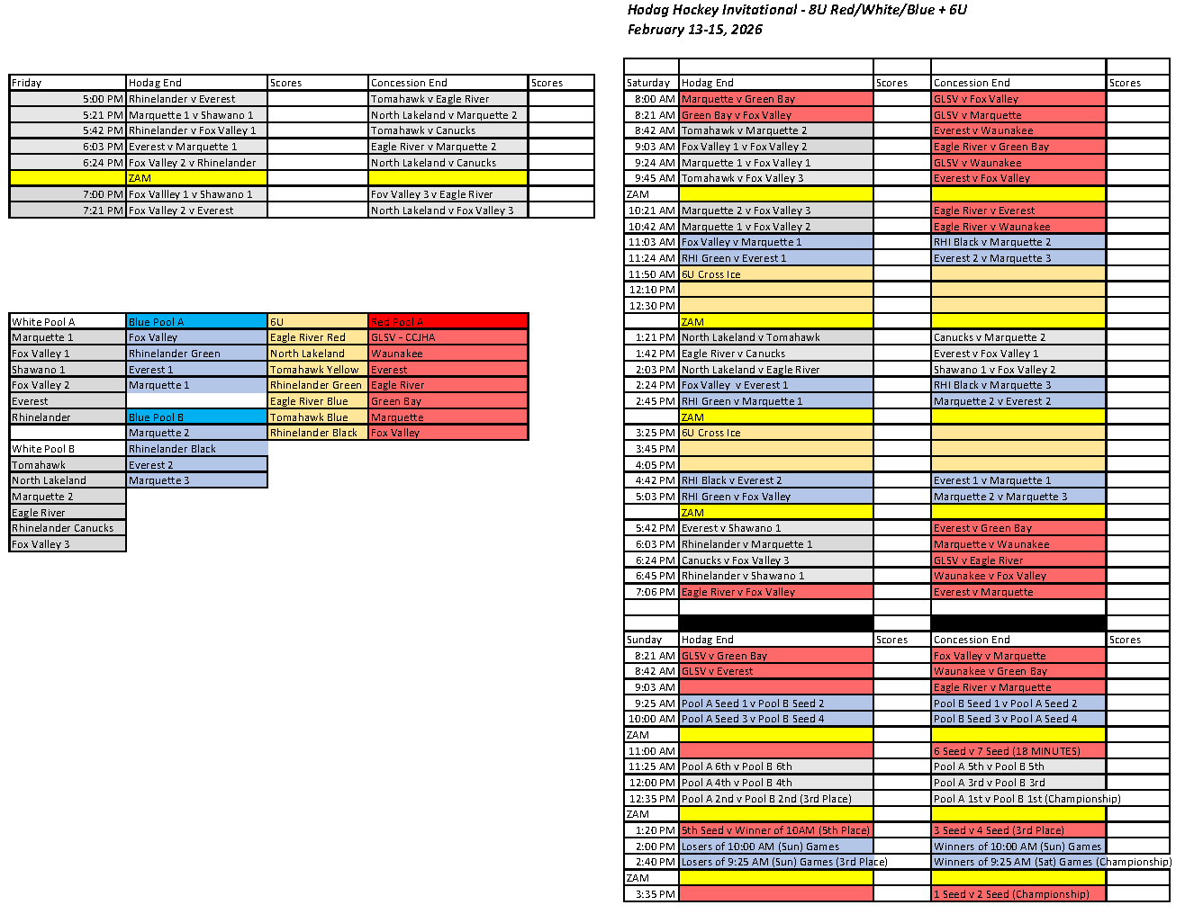 8U is Friday through Sunday, 6U is Saturday Only.