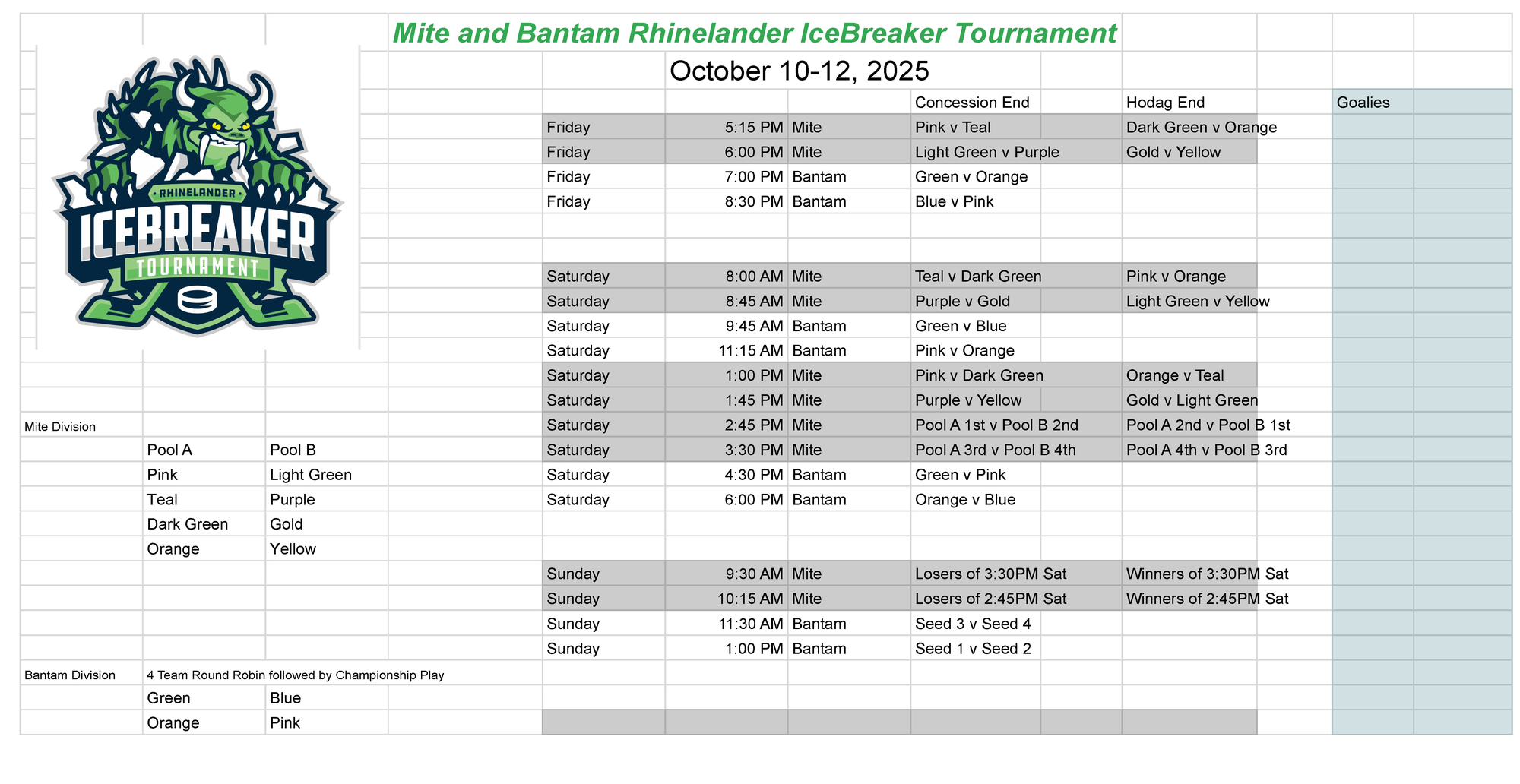 All teams at Squirt, Peewee and Bantam will be guaranteed 3 games. All teams at Mites will be guaranteed 4 half ice games.