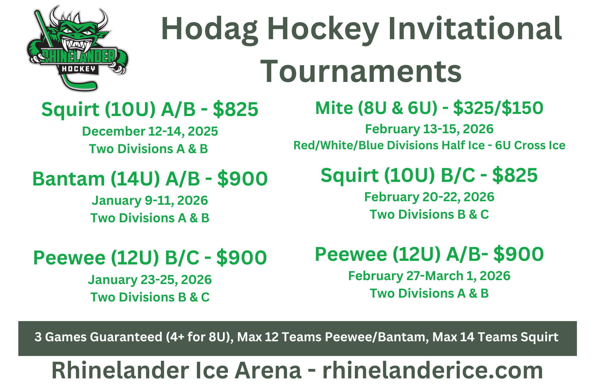 Signup for the Squirt B and Squirt C Hodag Hockey Invitational February 20-February 22, 2026.