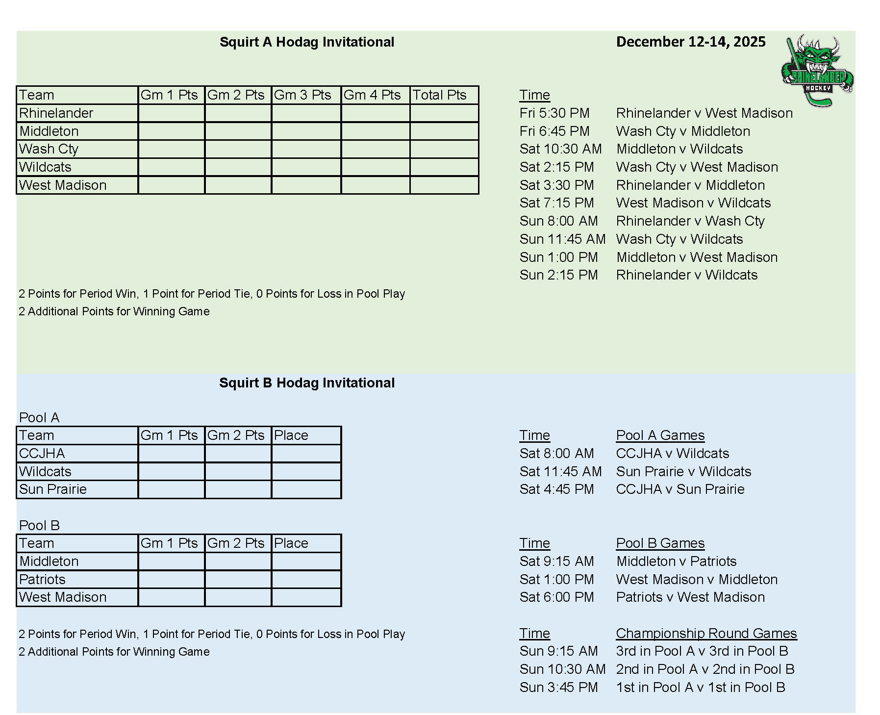 Signup for the Squirt A and Squirt B Hodag Hockey Invitational December 12-14, 2025